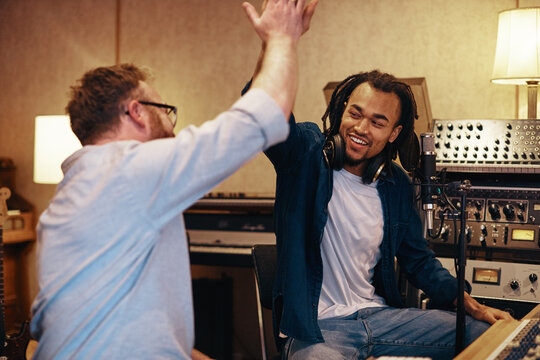 Smiling singer and producer high fiving together in a studio