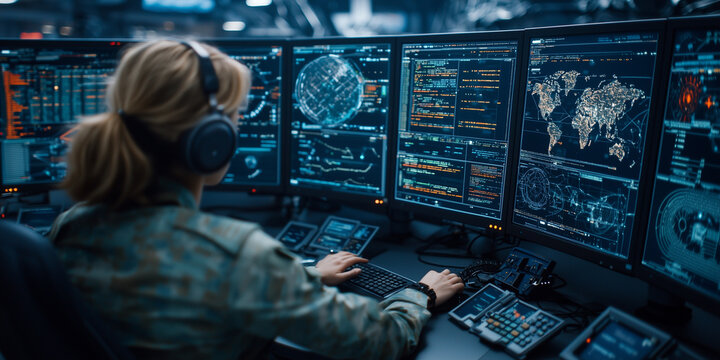 woman in high tech control room monitors multiple screens displaying global data and coding interfaces, showcasing dynamic and focused environment