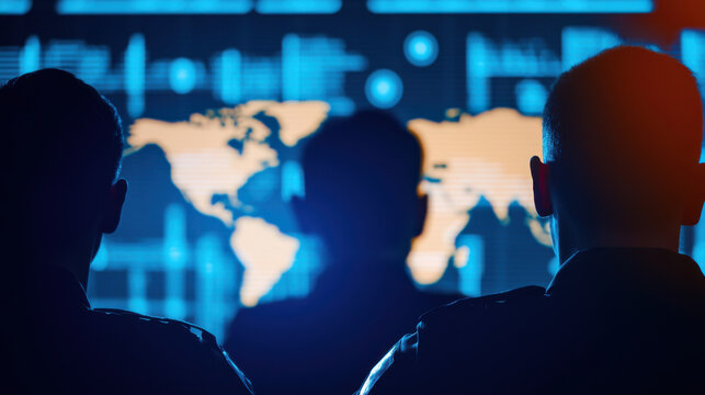 People in a high-tech control room analyze a large digital display showing global data and futuristic interfaces. The illuminated environment suggests advanced technological capabilities.