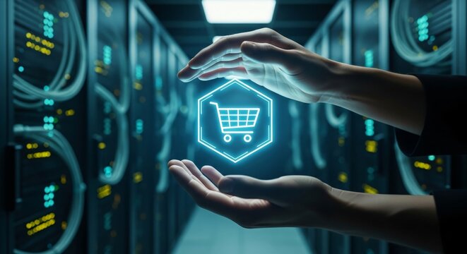Futuristic digital shopping cart icon hologram representing online retail ecommerce technology in a high tech data center environment for digital commerce marketing
