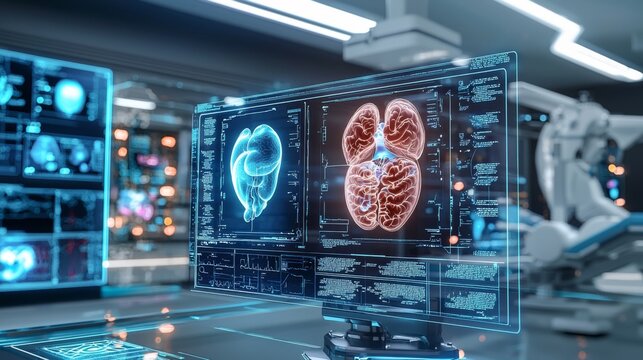 AI powered holographic displays in a high tech diagnostic center, showing internal organs in 3D