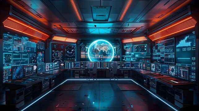 Futuristic High Tech Command Center with Holographic Screens and Touch Interfaces