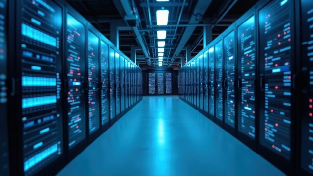 Vast futuristic data center hallway glows with vibrant blue server lights, promising cutting edge technology solutions and powerful digital infrastructure for innovation.