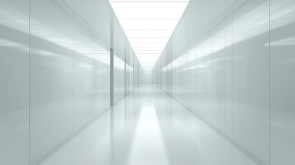Expansive modern data center server room with rows of glowing blue lights and illuminated aisle leading to bright exit