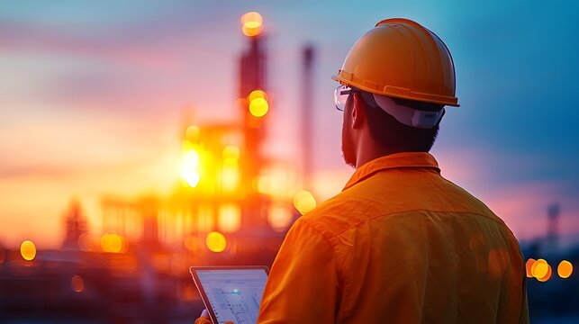 An engineer using a digital tablet to analyze and monitor fuel processing systems inside a high tech industrial facility at dusk with the city skyline visible in the background