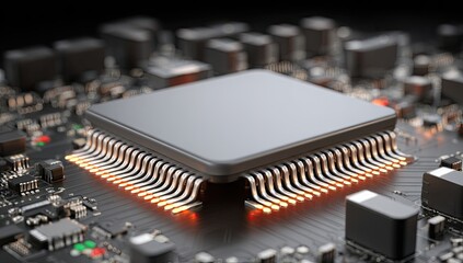 High tech microprocessor on circuit board, illuminated by warm light, showcasing intricate details and modern technology