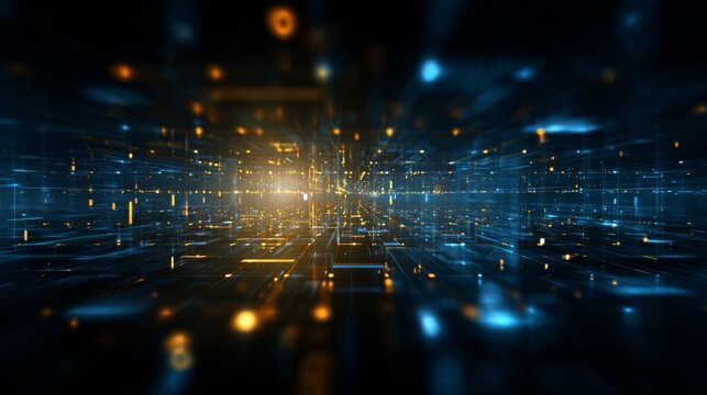 Abstract digital technology background with glowing polygonal lines and connecting dots, futuristic data network visualization, blockchain artificial intelligence communication and high tech innovatio