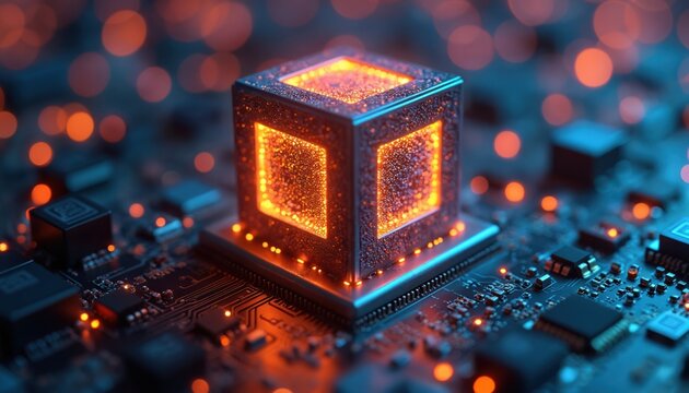 Abstract 3D cube visualization on circuit board, glowing orange light. Futuristic tech concept, digital network, innovation in cyber space. High tech data.