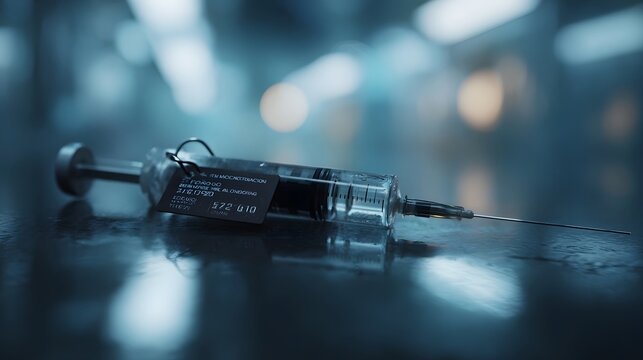 Advanced medical syringe with an identification tag and dark liquid resting on a reflective surface within a high tech sterile environment