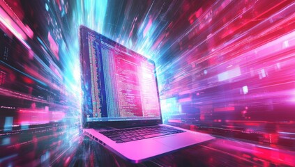 Laptop displaying code, surrounded by vibrant light streaks suggesting high speed data transfer.