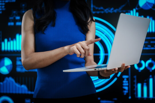 Professional woman working on laptop with futuristic data visualization background, representing digital analytics, business intelligence, productivity, advanced computing in high tech environment.