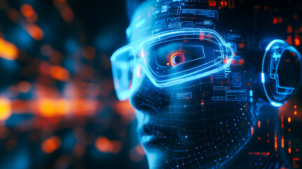 Airplane flying over futuristic digital muoverfuture monitoring panels