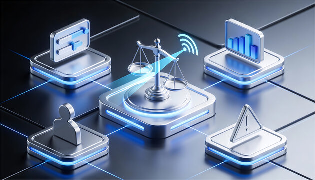 3D Render of a Sleek Digital Justice Scale Centered on a High Tech Hub Surrounded by Nodes for Analytics User Profiles and Warning Alerts Symbolizing AI Bias Monitoring