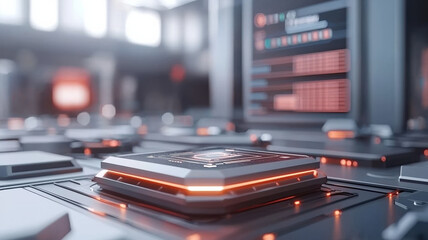 High tech industrial equipment with digital interface and glowing elements, showcasing advanced technology in modern facility