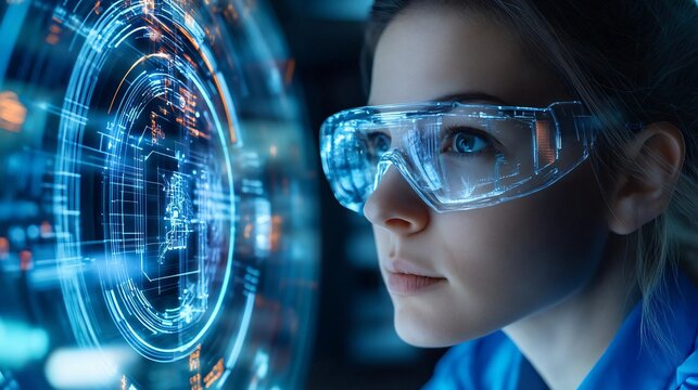 A focused woman using advanced technology with smart glasses, exploring high-tech data and digital interfaces.