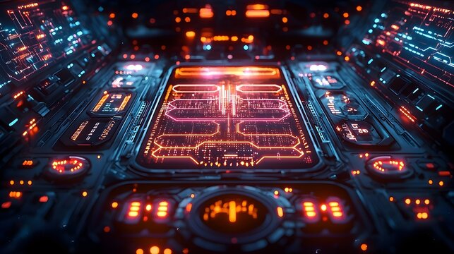 Futuristic digital interface with glowing orange elements, showcasing high tech design for data visualization