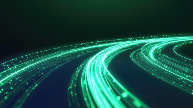 Green light trails with glowing particles represent fast digital data transfer, high speed internet, and global network connections, illustrating advanced technology concepts