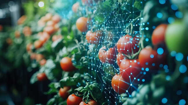 AI generated high tech indoor smart farm with lush green vegetables glowing under digital light grid showing futuristic precision agriculture and real time environmental control system