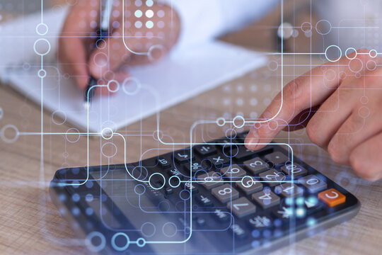 A research and development specialist computing the data to create a new approach to develop high tech business. Technological icons over the desk with calculator.