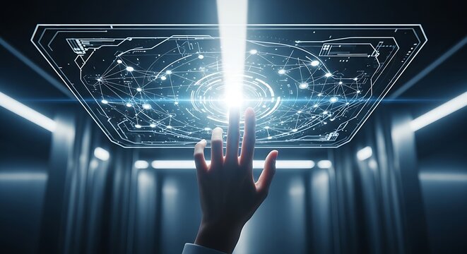 Hand interacting with futuristic interface in a brightly lit high tech environment setting scene