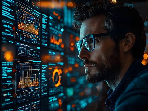 A man wearing glasses intently studies complex data on futuristic digital screens in a dark high tech environment