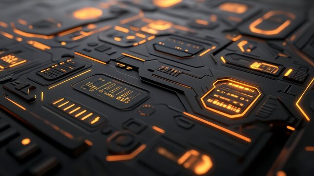 Abstract Futuristic Circuit Board With Glowing Orange Lines And Dark Backgrounds