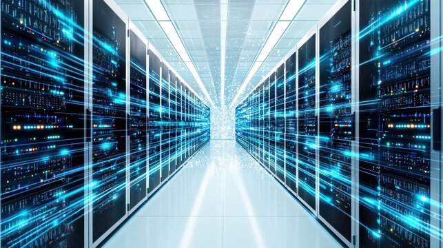 Data Center Server Room with Blue Light Streaks