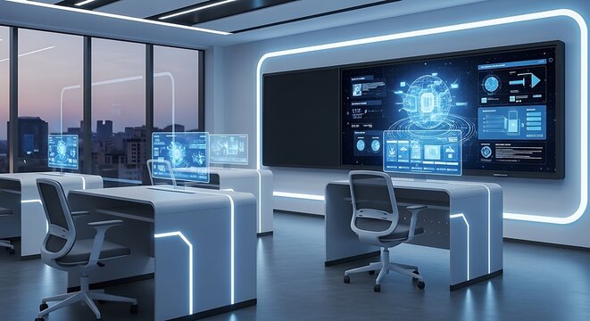 advanced technology modern control room with futuristic digital screens
