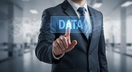 Data analysis innovation for business intelligence using virtual touch interface in a high-tech corporate setting with futuristic design and interactive digital workspace for decision making