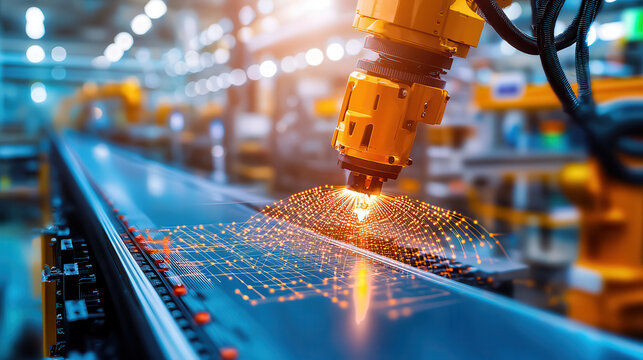 robotic arm in high tech factory uses AI driven holographic blueprints for precision manufacturing, showcasing advanced technology and automation