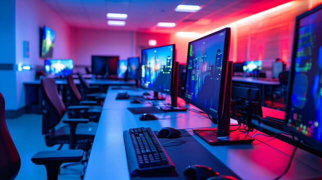 Futuristic Cybersecurity Operations Center with Multiple Workstations