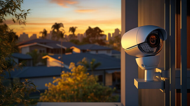 a high - tech smart security camera perched on the edge of a residential building, overlooking a quiet suburban neighborhood during twilight