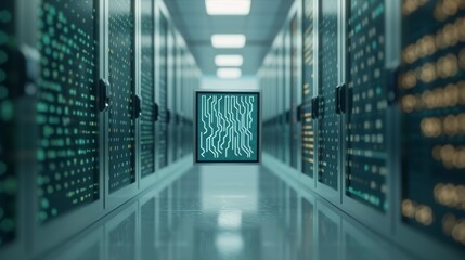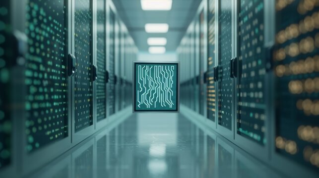 Futuristic Data Center Concept with Digital Chalkboard Displaying Binary Code and Circuit Lines, IT and Cybersecurity Theme