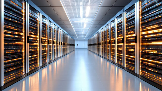 Gleaming server room corridor with rows of illuminated data racks, showcasing modern technology and digital infrastructure for global connectivity