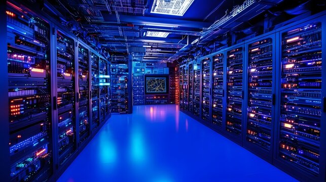A futuristic data center corridor filled with glowing blue server racks illuminated by modern lights, technology, artificial intelligence, cloud storage, big data, machine learning and innovation.