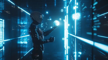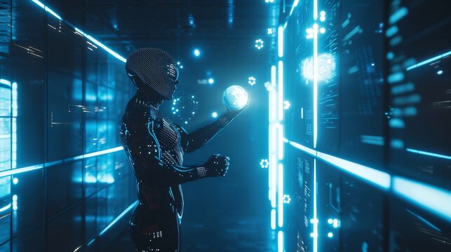 Man contemplating in high-tech server room with digital elements