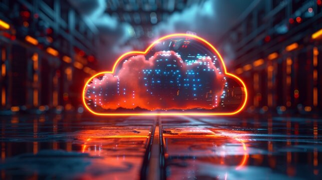 Futuristic Holographic Cloud Storage System with Blue Neon Lights in High Detail Digital Art