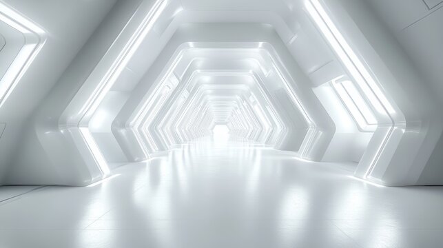 Minimalist futuristic white corridor with glowing walls and bright light, symbolizing innovation, high technology, architectural precision, and the infinite path of modern scientific progress.