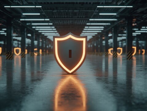 Futuristic data center corridor with glowing shield security symbol, high tech environment visualizing cybersecurity protection, trust, and digital defense
