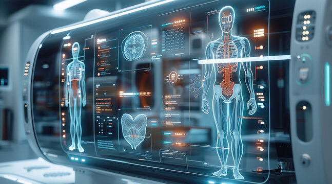 A high-tech medical scanner with a transparent display, showing 3D anatomical models, real-time diagnostics, and treatment suggestions. Generative AI.