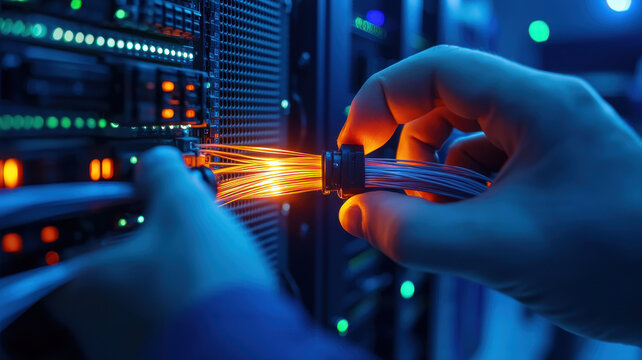 Data center with high-tech server racks and digital overlays