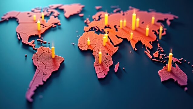 3D rendering of a stethoscope on a digital world map showcasing data visualization elements in global healthcare advancements