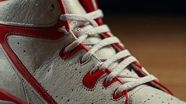 Side view of a high sneaker with red and black accents.