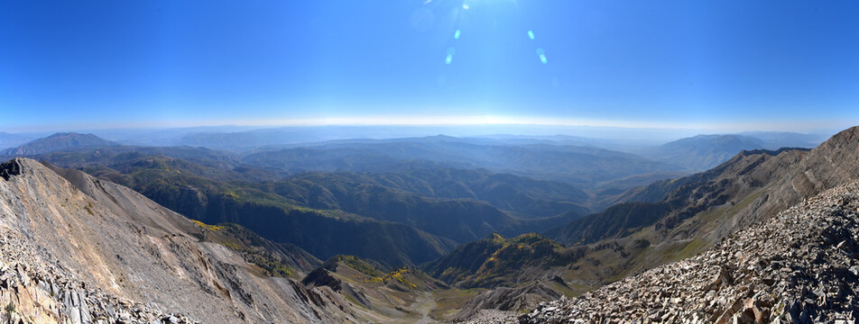Views from hiking trail of Mount Nebo Wilderness Peak 11,933 feet, fall leaves panoramic, highest in the Wasatch Range of Utah, Uinta National Forest, United States. USA.