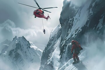 high mountain rescue operation, rescue worker helping by helicopter to save climbers trapped