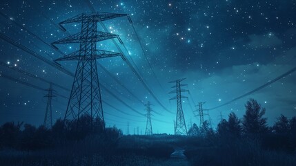 Energy concept. Electric transmission towers with glowing wires against. High voltage electrical pylons.