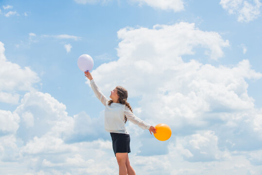 Fly with helium balloons. Higher and higher everyday. Cheerful girl have fun. Summer holidays and vacation. Childhood happiness. Happiness concept. Freedom concept. Happiness is air balloons