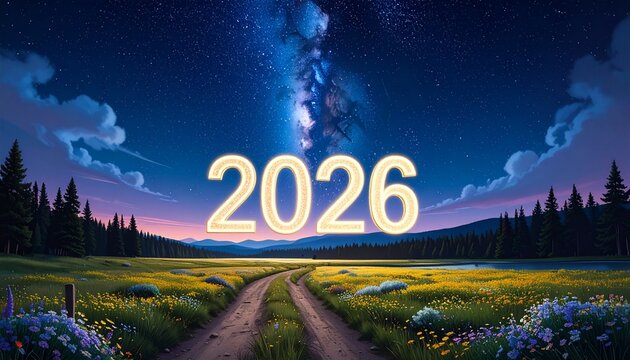 Scenic nighttime landscape with white “2026” text and comet arc over starry sky and Milky Way, grassy field with campfire and people, lit cabin, mountain backdrop, evoking serene future aspirations.
