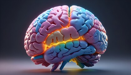 A colorful, abstract cross-section of the human brain, with different regions highlighted in various shades of pink, blue, and orange. The image appears to be a digital rendering or computer-generated