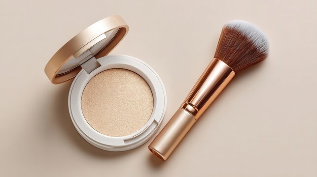 An elegant highlighter compact with a mirror, opened on a white background with branding space